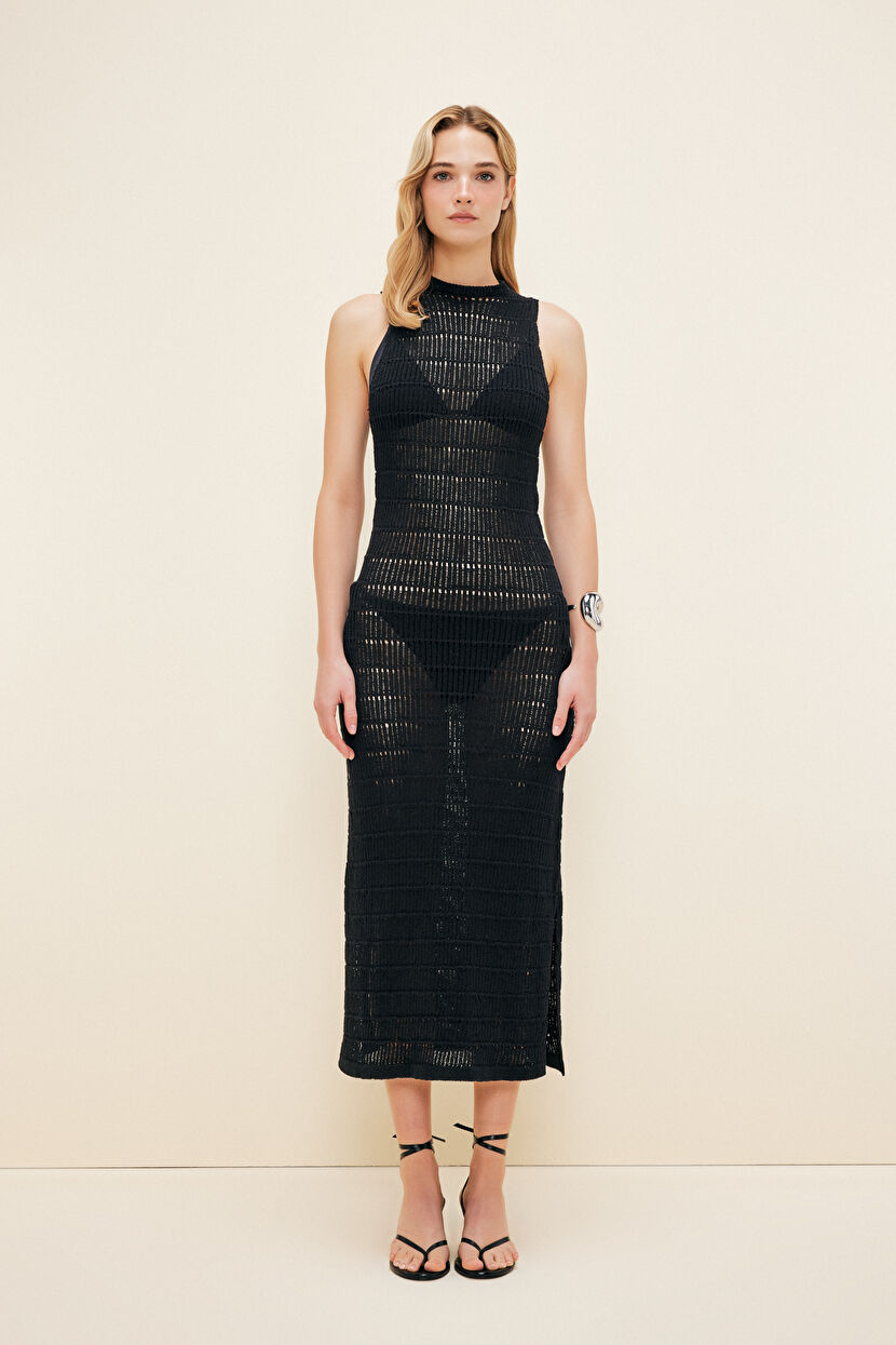 Siyah Moda Tutkusu Bisiklet Yaka Salaş Triko Elbise